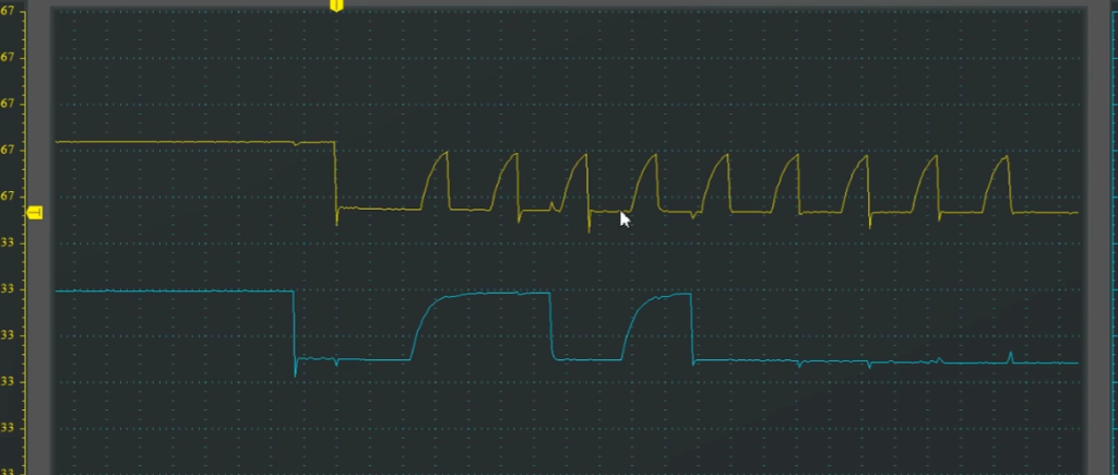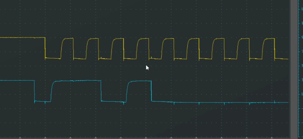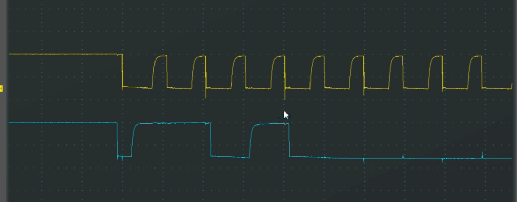 这是400kHz频率下的波形,可以发现这时的波形已经十分明显了,SCl还没完全回弹到高电平,马上就被低电平拉下去了,在快速传输过程中,这个回弹高电平的延时就限制了I2C总线的最大传输速度。