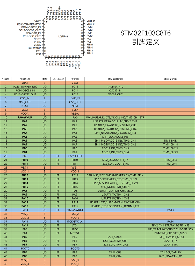 软件I2C的两个通信引脚是可以任意更改的,软件I2C的引脚就是普通的开漏输出模式,硬件接在哪个引脚上,程序中就对应操作哪个引脚即可,但是硬件I2C,通信引脚是不可以任意指定的,我们需要查询以上引脚定义表,来进行引脚的规划,如果使用硬件的I2C1,就需要接在PB6和PB7,I2C1可以重映射,还可以更换为PB8和PB9。I2C2引脚为PB10和PB11,但没有重映射的引脚,所以I2C2只能选择PB10和PB11.