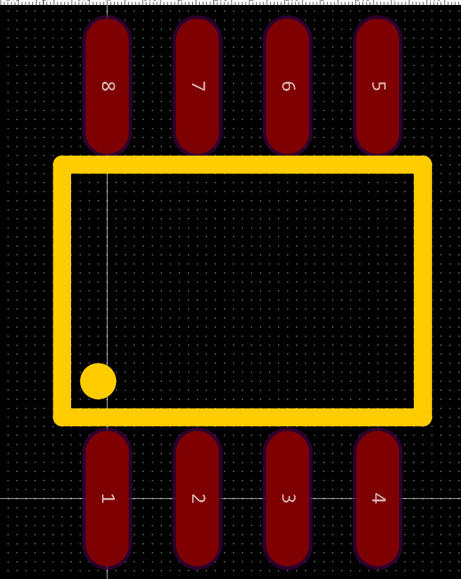 这样这个芯片就已经绘制完成了,之后需要将我们绘制的封装和我们前面画的LM358DT的元件符号进行一个绑定,我们点击库,找到这个元器件,点击关联封装,然后我们来测试我们自己画的封装,新建一个test工程,将我们库中的设计好的原理图放到图纸上,再转到PCB,就可以看到我们之前封装好的PCB图。