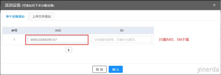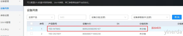 设备管理->设备列表->添加设备。可以用微信扫码设备IMEI后添加(不用填写SN),如果添加成功,能看到产品型号和设备IMEI。产品型号后面创建分组需要使用。