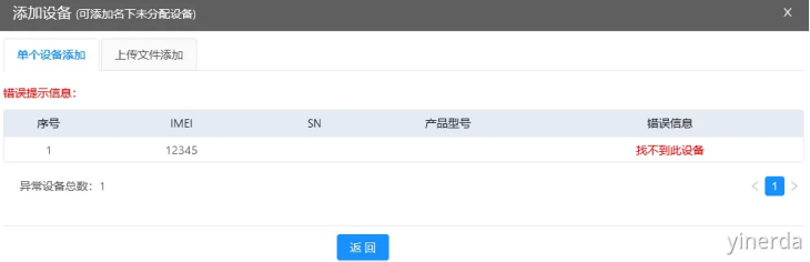 如果提示:“找不到此设备”表示设备没授权,核查一下设备IMEI是否输入正确,如果正确需要联系销售授权后再添加。