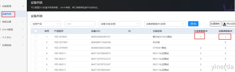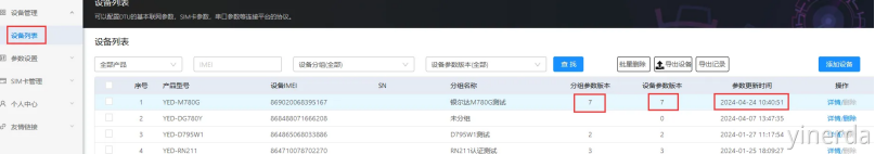 如果有多台设备,可以在设备列表里面查看,当“分组参数版本” 等于“设备参数版本”,表示参数更新了。