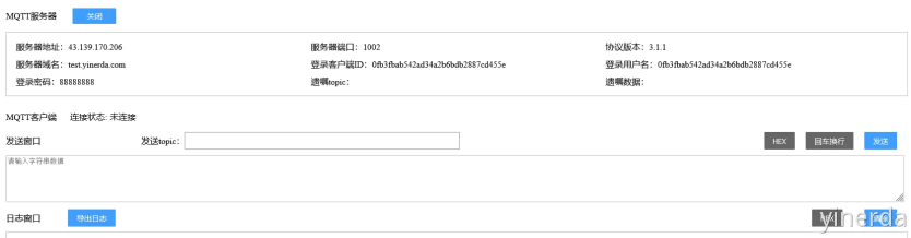 打开DTU测试平台:http://test.yinerda.com,选择“MQTT测试工具”,点击“打开“,可以获取到MQTT测试IP地址/域名 和端口号,登录客户端ID,登录用户名,登录密码。 IP地址或者域名就是TCP的服务器地址,任选其一。