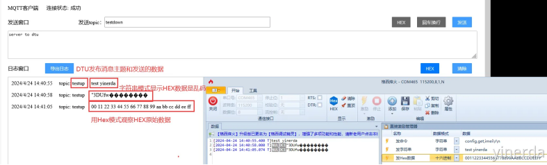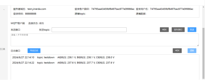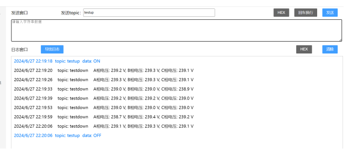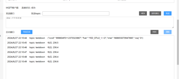 将日志窗口改为HEX显示,我们就能够看到由电表采集后,用串口发送给DTU,然后DTU再通过4G发送到MQTT服务器上的A相电压数据了。