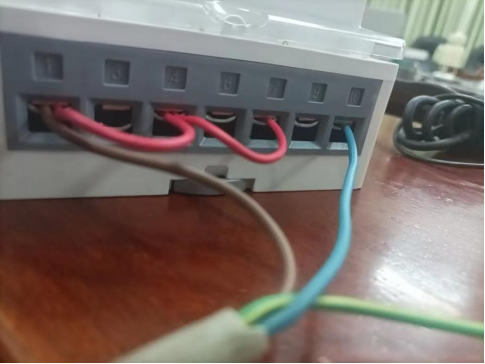 注意三相电能表的,A相、B相、C相口串联(1号口、4号口、7号口串联),将电源线相线接在A相口(1号口)出,零线接在10号口。注意接口要夹着铜丝,不能夹着胶皮,会导致电路不通。这里串联A相、B相、C相的线没有太大要求,只传输电压,没有负载,普通的铜丝线就行。