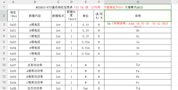 00 00:要进行读取的寄存器地址,在前面提供的下载链接中有该电表的通讯地址表格,每个地址对应的寄存器储存着各自的内容,比如地址00 00寄存器存储着A相的电压,数据格式为int整型,数据长度为1字即2个字节,单位是0.1V,即得到的数据要除以10才能得到真正的电压。
