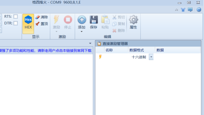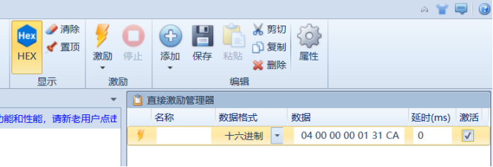 右方就会出现直接激励管理器,激励其实就是发送,我们在数据这一栏填写我们要发送的指令,然后点击激励就能够发送了,注意发送的数据格式要为16进制,同时我们把显示的HEX也打开,这样我们收到的数据也就会是以16进制的格式显示了。