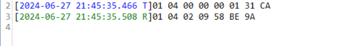 举例,我们发送一条指令:01 04 00 00 00 01 31 CA