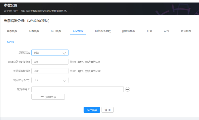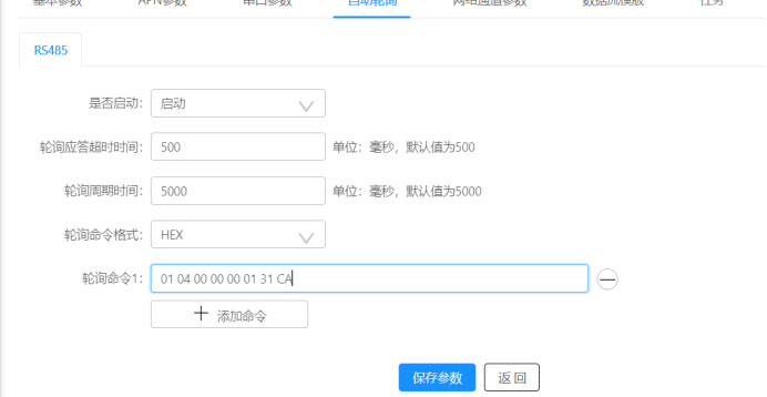 这个自动轮询就是过一段时间就从DTU的串口中发送出一条数据,我们可以通过改写这里的轮询命令1来控制这条数据,我们要写的就是前面用电脑直接发送给电表的读A相电压操作的指令。